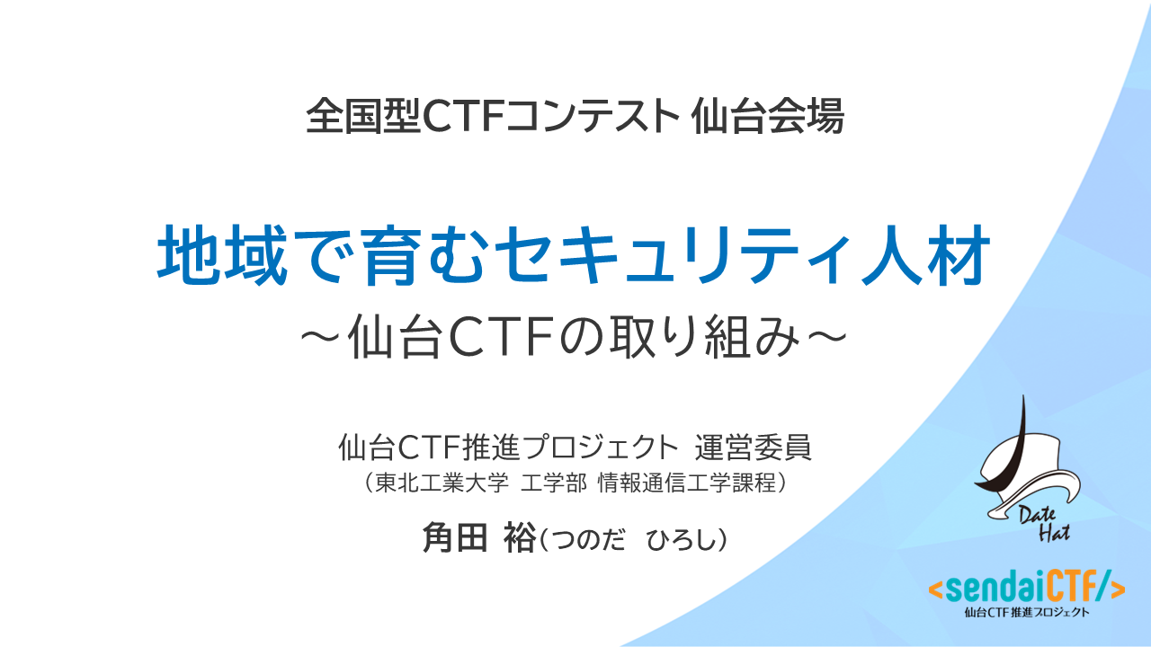 2025年11月8日に開催された全国型CTFコンテスト仙台会場において,仙台CTF推進プロジェクト 運営委員として下記の地域講演を行いました.